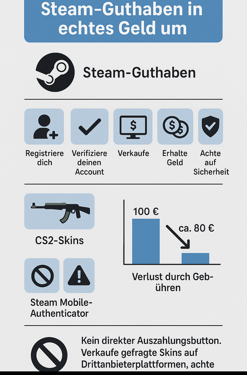 Ergebnis: Von euren ursprünglichen 100 € Steam-Guthaben kommen am Ende etwa 80 € auf eurem Bankkonto an. Der Verlust liegt also oft zwischen 20 % und 30 %.