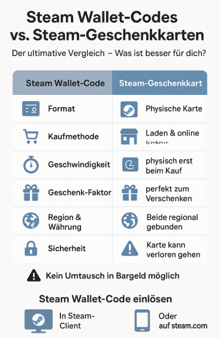Wallet-Codes kannst du nur online erwerben und erhältst sie sofort per Mail oder Anzeige. Steam-Geschenkkarten findest du im Laden (Supermarkt, Elektronikmarkt) und online. Geschenkkarten sind ideal, wenn du bar zahlen möchtest; Wallet-Codes bieten maximale Online-Bequemlichkeit.