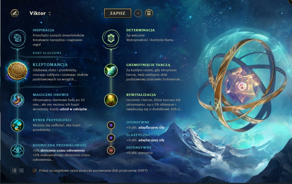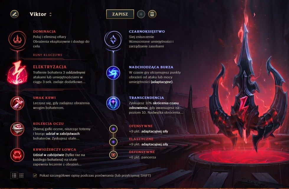 Dla Viktora mam dwa zestawy run. Pierwszy wybieramy, kiedy gramy na midzie i budujemy się bardzIej ofensywnie. Drugi jest zalecany, gdy gramy na topie, wtedy kupujemy bardziej defensywne przedmioty.